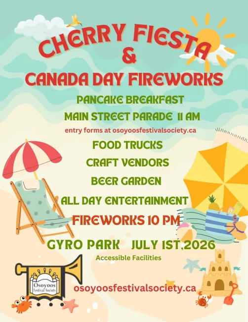 Locations include Main Street, downtown Osoyoos (parade), and Gyro Park.