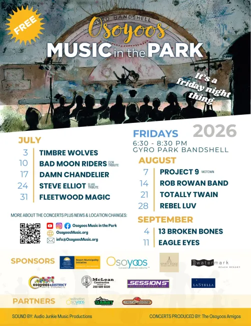 Fridays throughout summer, enjoy free live music in Osoyoos, lakeside at Gyro Park Bandshell.