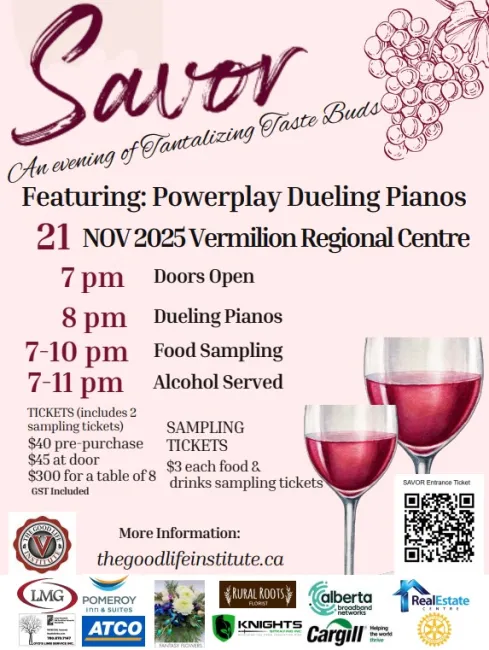 Join Vermilion's culinary community for an evening of sampling beer, wine, spirits, scotch and appetizers at SAVOR on November 21, 2025 at the Vermilion Regional Centre.