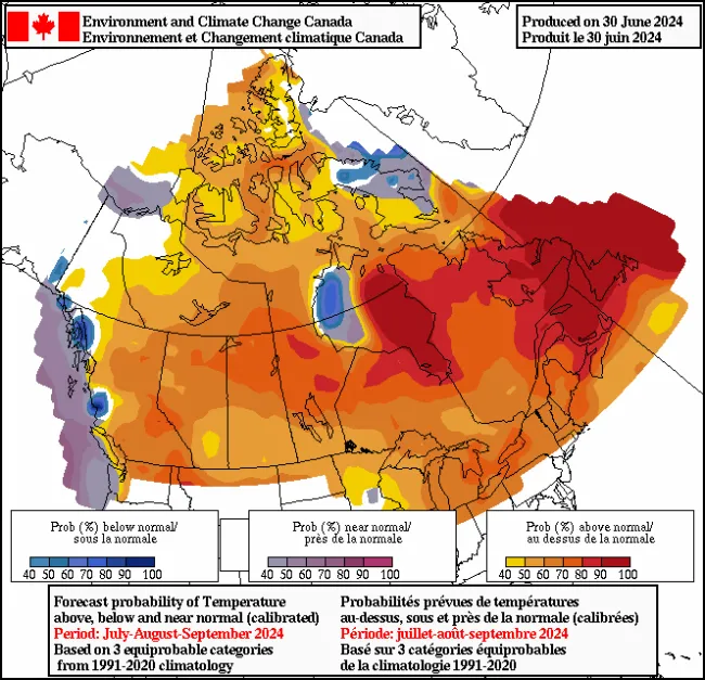 "Long range forecast models across the board continue to forecast warmer and drier than average conditions through July and August across BC and Alberta. In BC, there could be periods of true, hot weather throughout the interior and South Coast. In Alberta, periods of hot, humid weather could be possible thanks to the transpiration of maturing crops following the wet conditions in recent weeks."