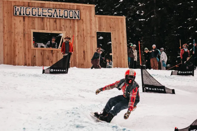 Skiers and riders get creative in how they are going to tackle the skim pond – with DJ’s delivering the beats to keep things funky. Part two features the Ymir Wiggle, a western-themed dual banked slalom.