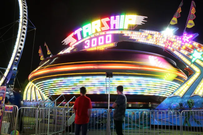 The fair had renewed energy once the rodeo ended and the sun set. Games, rides and food trucks were lit up and the crowd came alive. The air was filled with screams of joy and laughter, the ringing of prizes and bells, and the drifting smells of deep-fried food and popcorn.